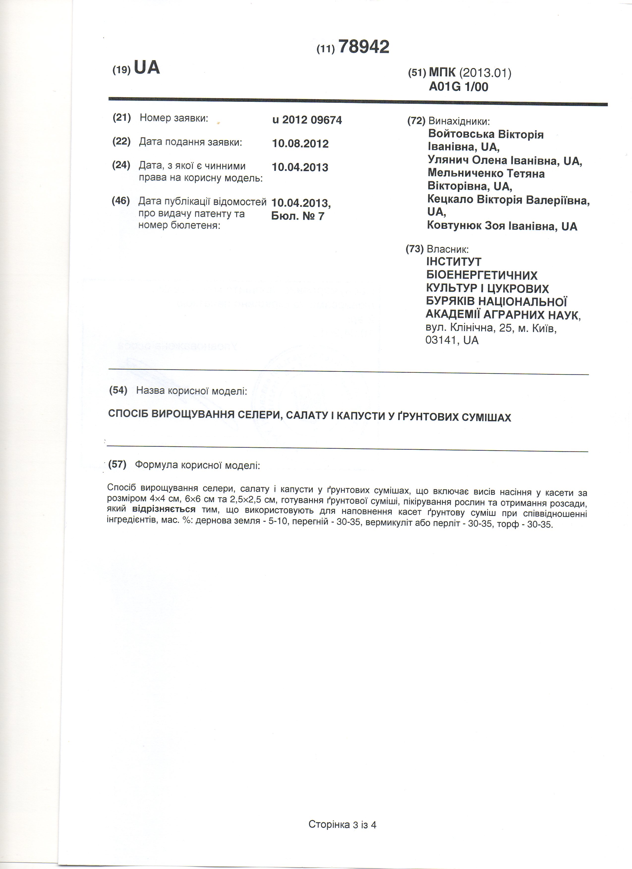 Патент на корисну модель № 78942. Спосіб вирощування селери, салату і капусти у грунтових сумішах.