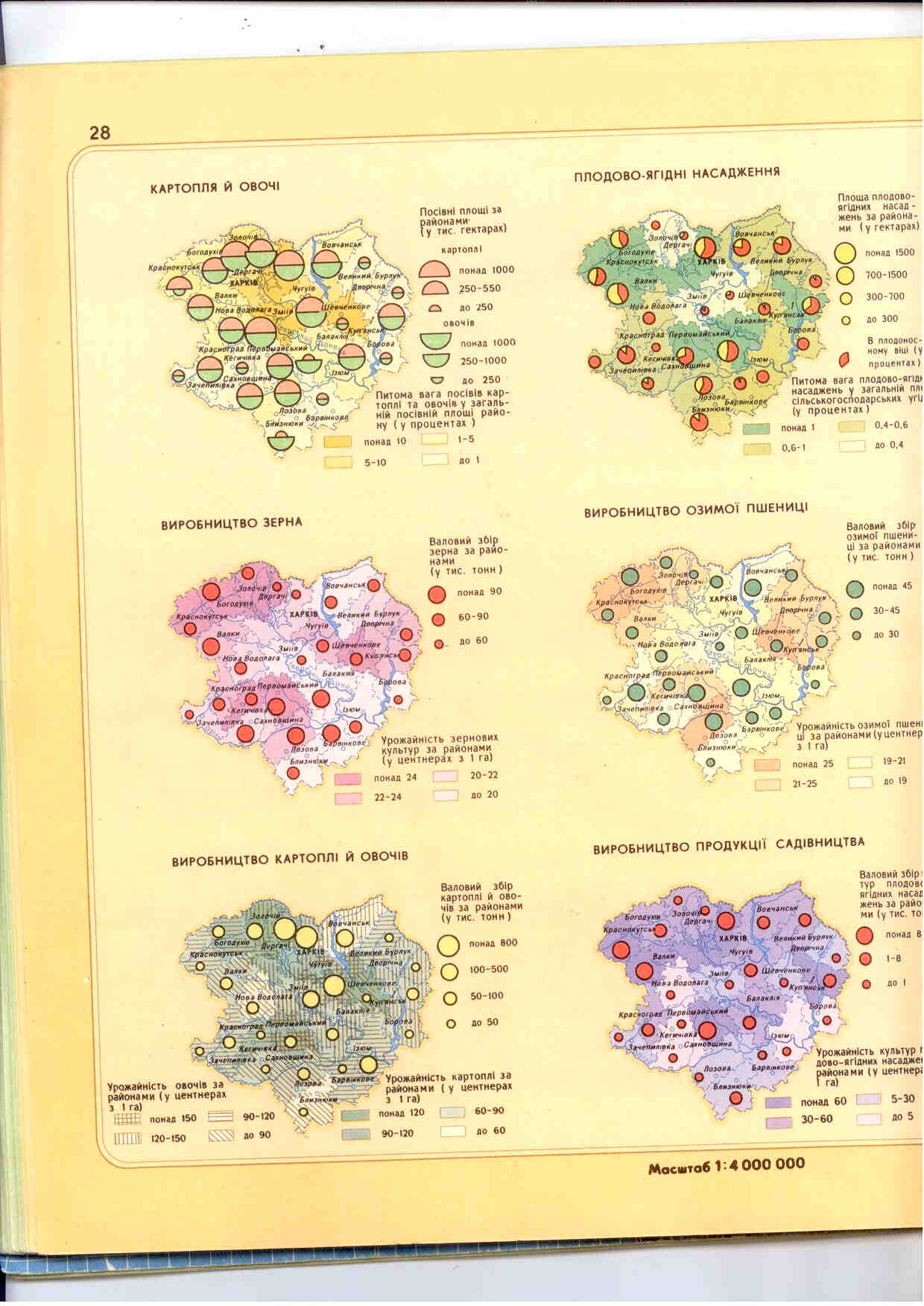 В серії карт у образно-знаковій формі відображено виробництво окремих видів сільськогосподарської продукції у всіх типах господарств Харківської області