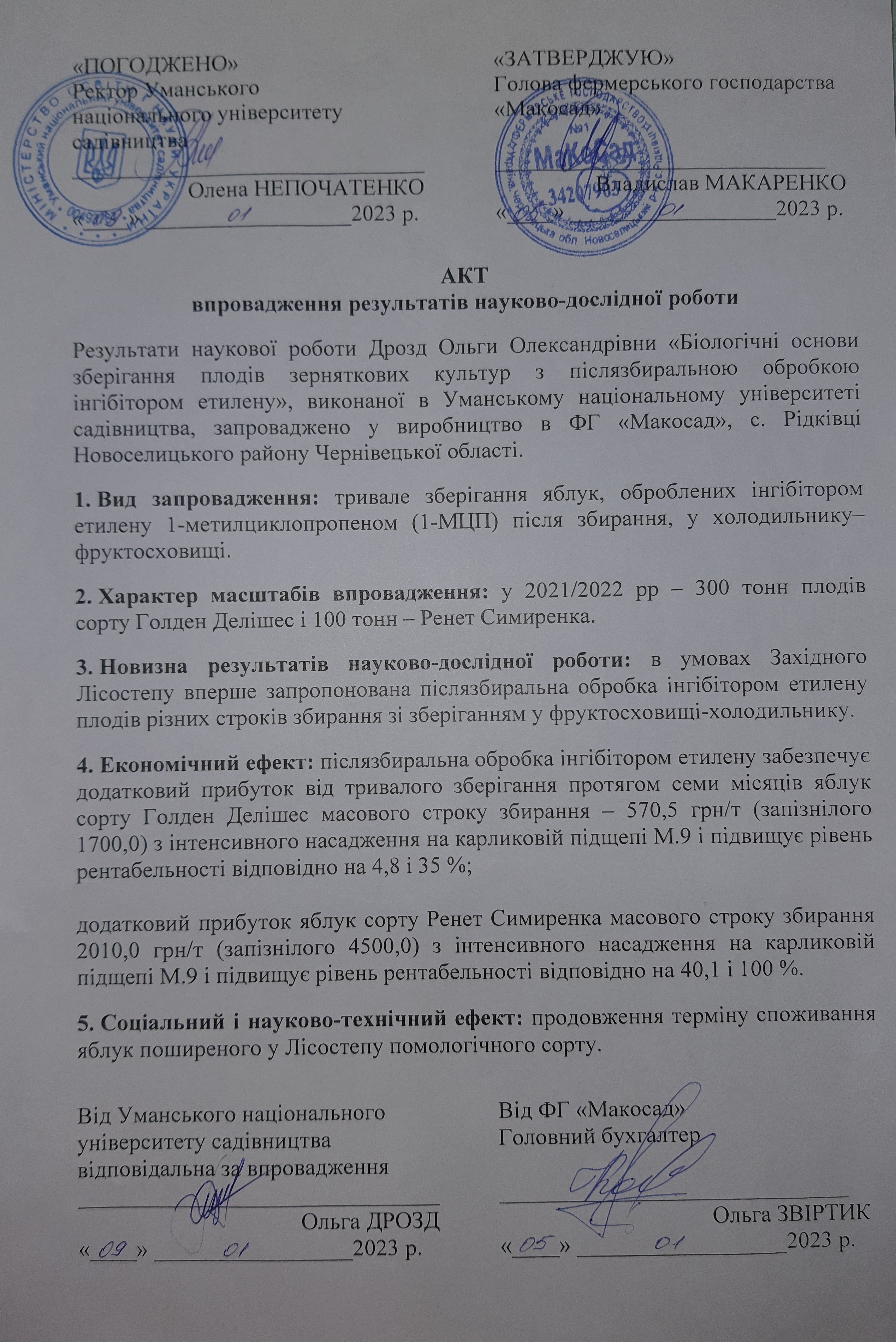 Акт впровадження результатів науково-дослідної роботи у ФГ Макосад.