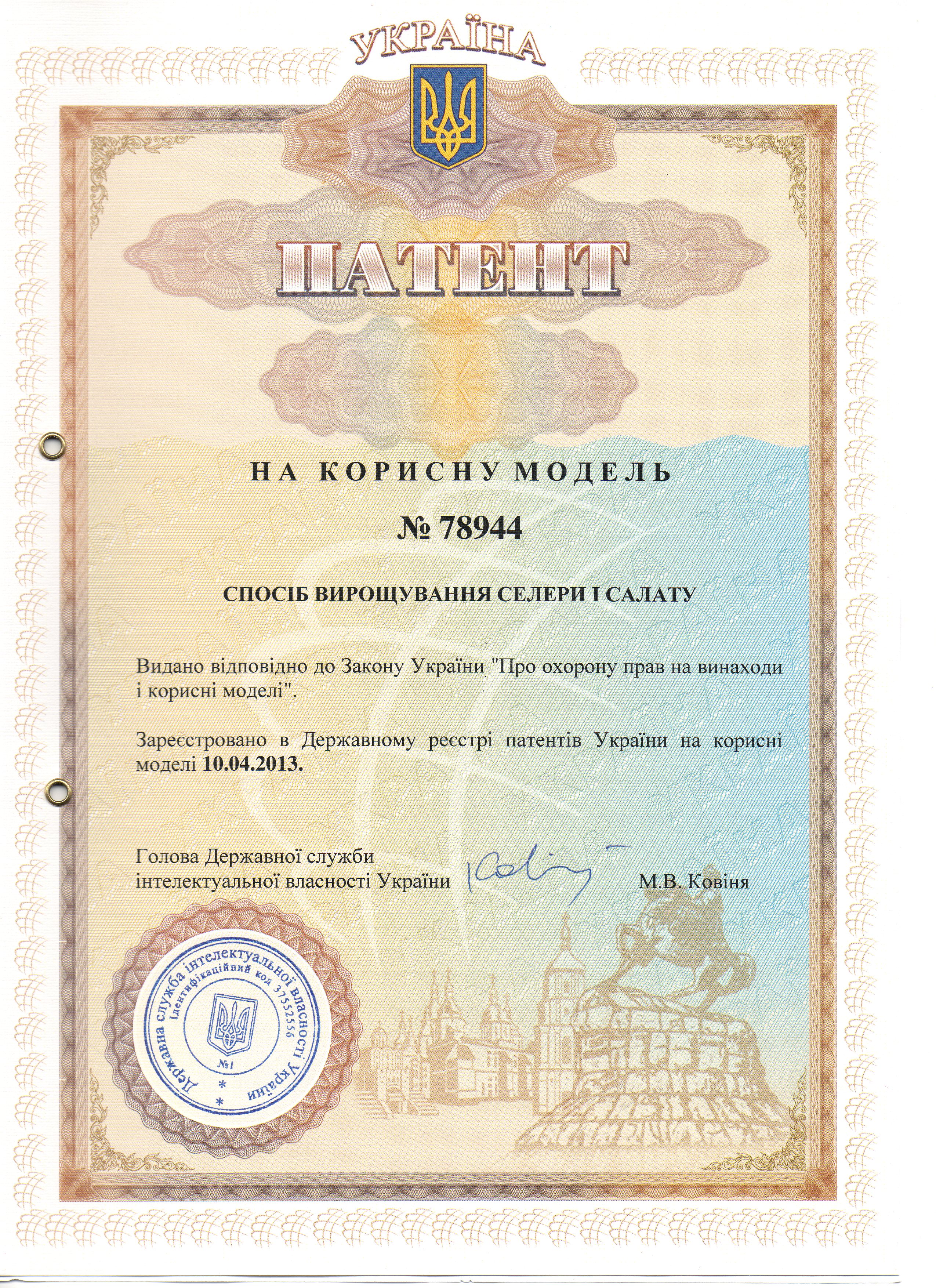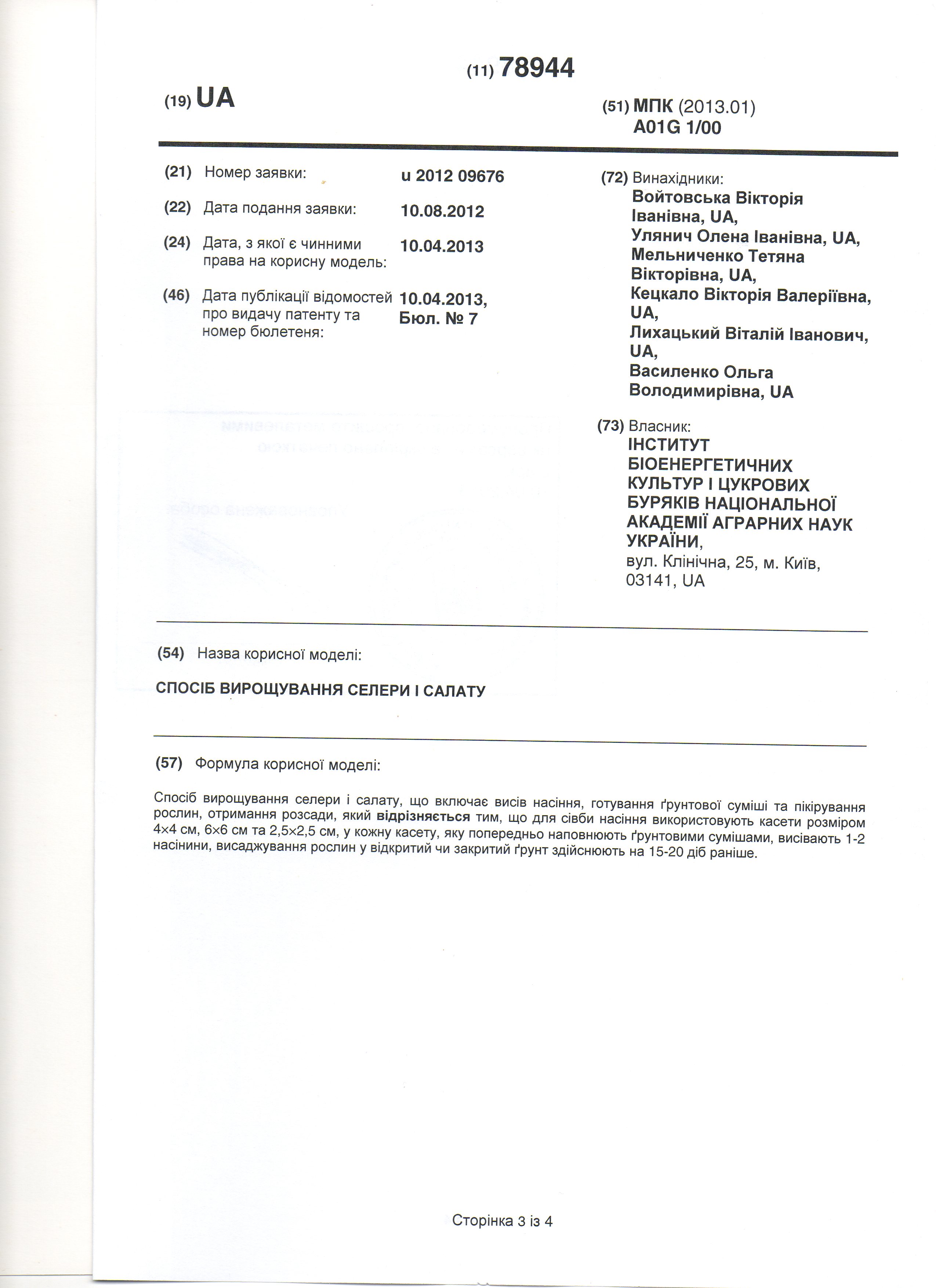Патент на корисну модель № 78944. Спосіб вирощування селери і салату.